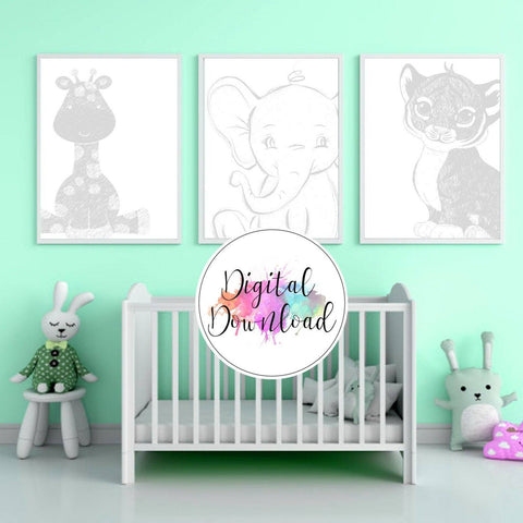 Sofortiger Download-Set mit 3 Kinderzimmer-Drucken – Cartoon-Zootiere mit Skizzeneffekt