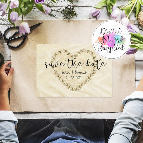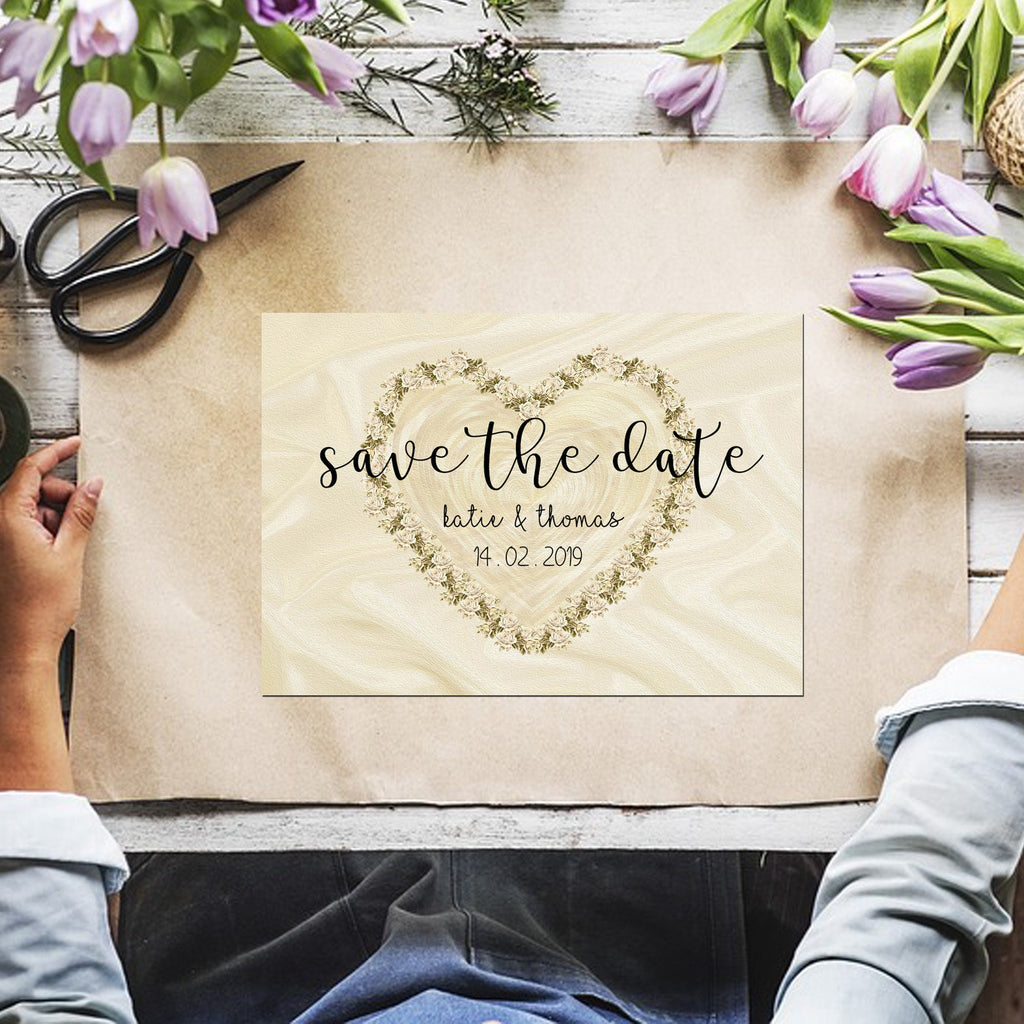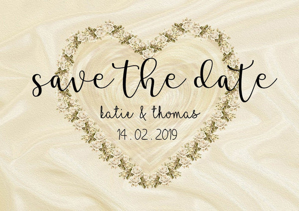Diese wunderschönen Hochzeits-Save-the-Dates verfügen über ein Blumenherz mit Rosen, das sich perfekt für alle romantischen und klassischen Themenhochzeiten eignet.
