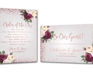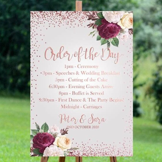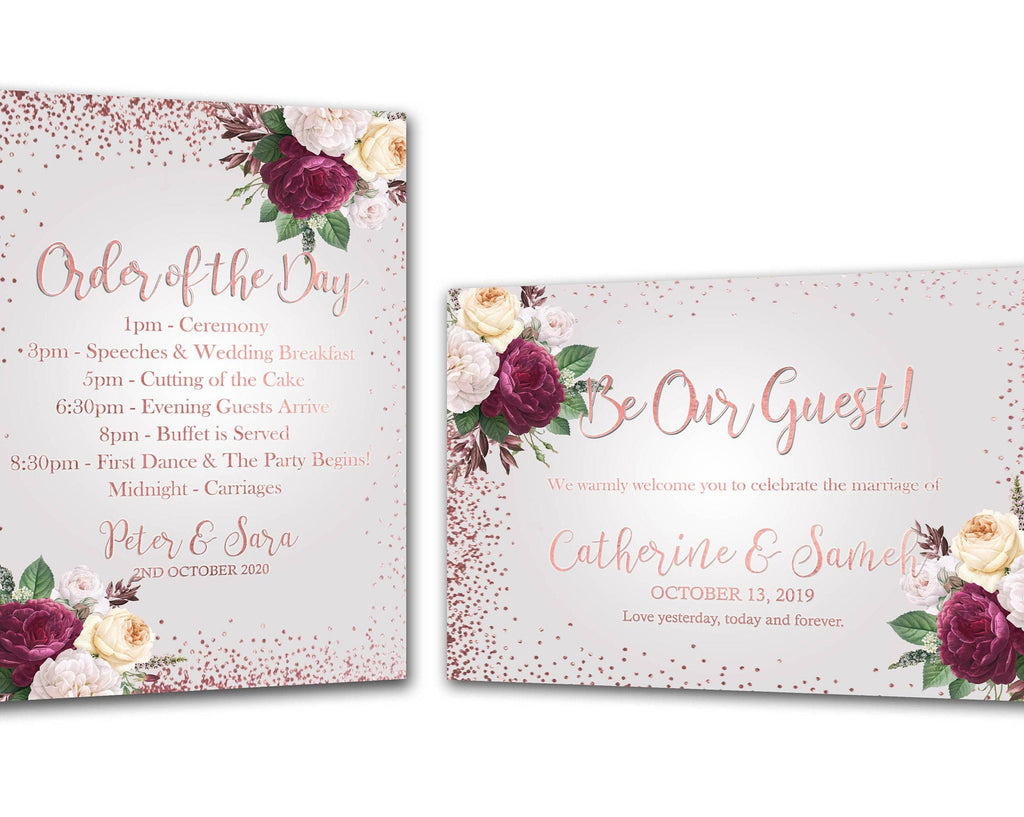 A1 roségouden bordjesbundel - 1 x Welkomstbord (liggend) & 1 x Orde van de dag (portret). Deze items zijn een fantastische manier om gasten op je bruiloft te verwelkomen. Deze zijn op dik karton gemonteerd.