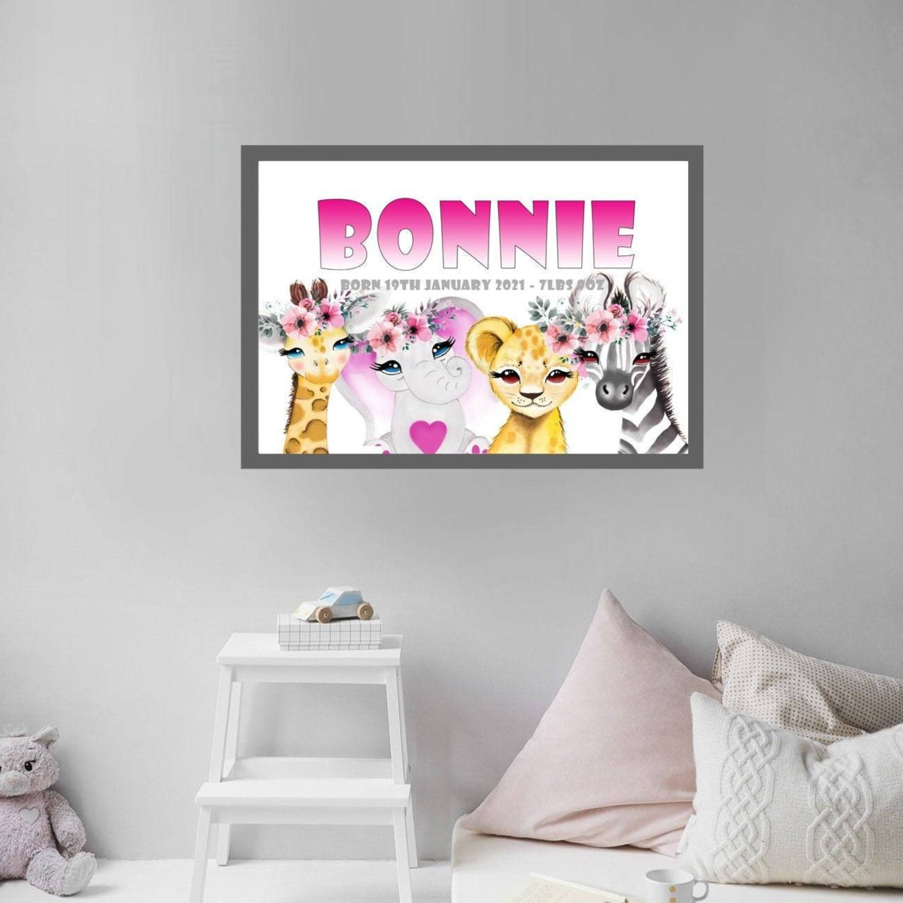 Op de print staat de naam van het kind, de geboortedatum en het gewicht bij de geboorte. De print wordt afgedrukt op A3-formaat 300gsm glanzende finish kaart.