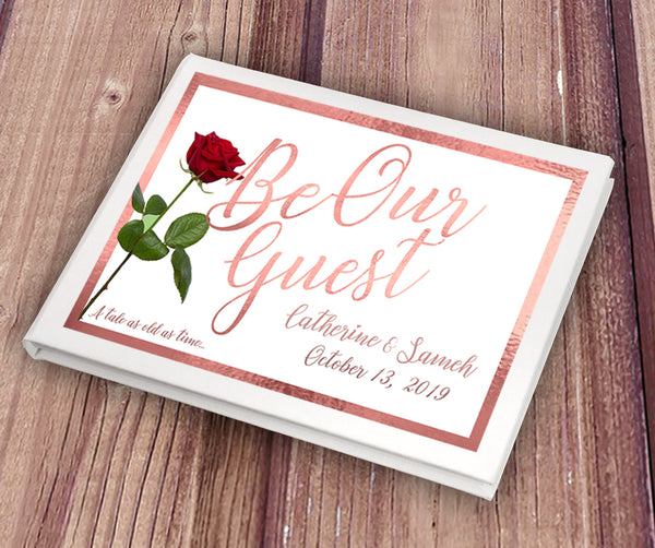 Personalised Be Our Guest, Beauty and the Beast white wedding guest book with your new married name and your wedding date. Perfect for anyone looking at add a personal touch to their big day. These items are made to order. Contains 22 pages & comes presented in a box with a perspex lid.