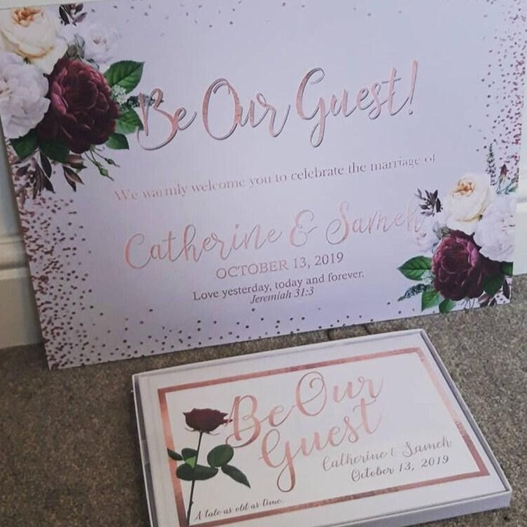 A bundle of beauty and the beast themed wedding items, personlised and made to order. 1 x wedding guest book, 1 x A3 welcome sign. Details below: