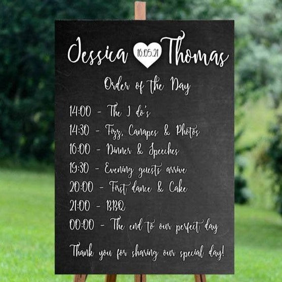 Order of the day sign on A3, A2 or A1 mount board. This item is a fantastic way to welcome guests to your wedding. Simply supply your names and wedding date and order of the day in the order notes on the cart page, or alternatively send via email to atouchofsilkweddings@gmail.com