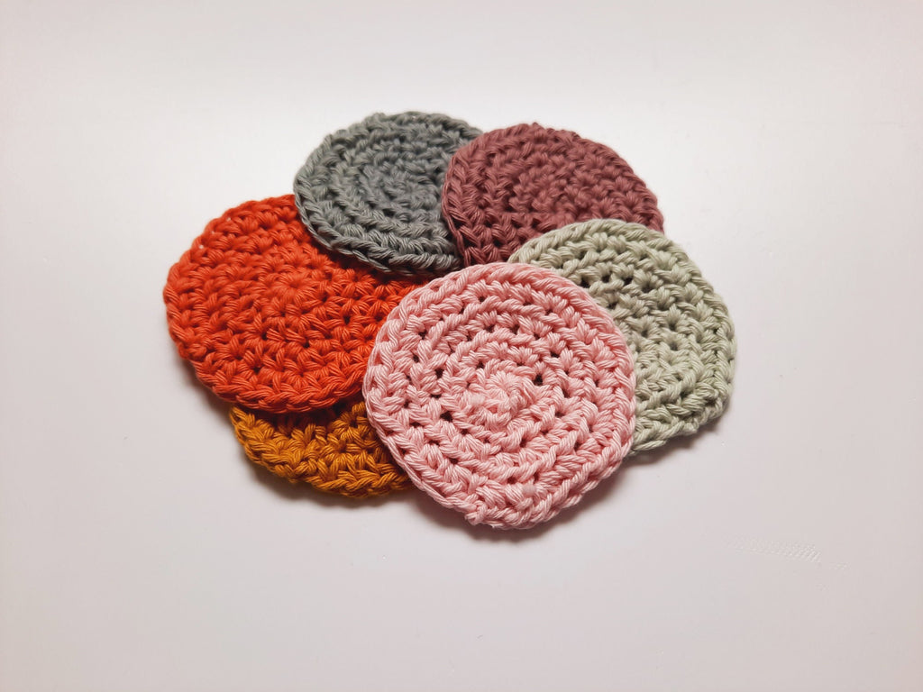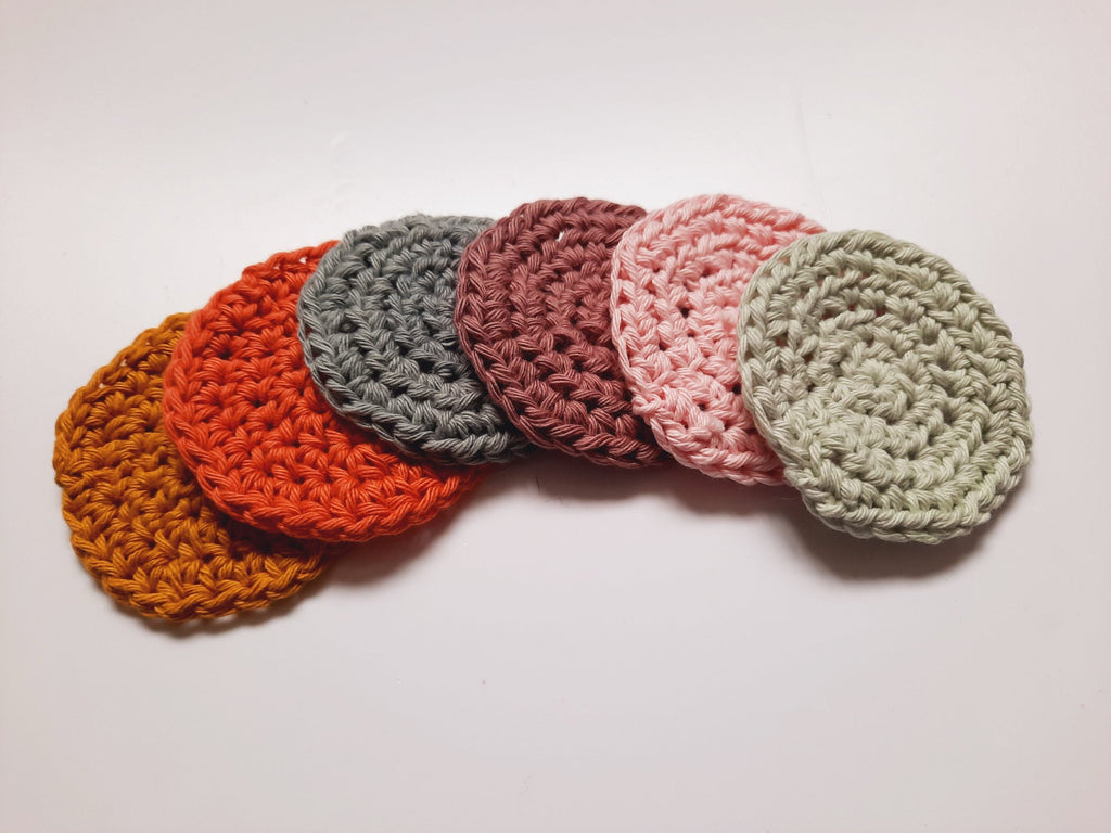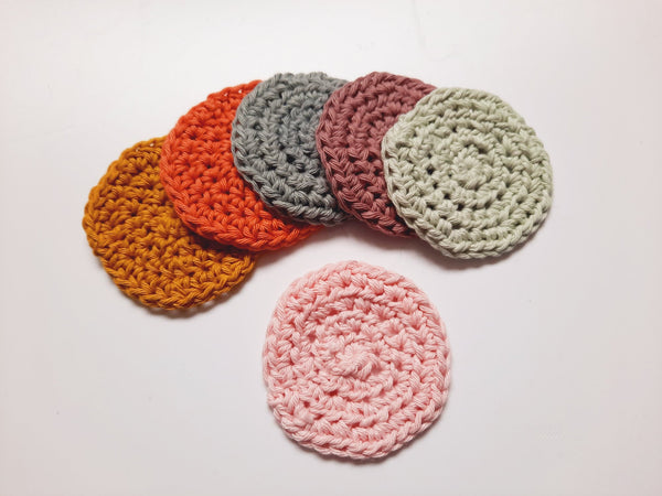 1 x Pack of 6 Reuseable Handmade Scrubbies which are an eco-friendly alternative to using disposable cotton face pads - Machine washable at 30c (mixture of colours in pack)